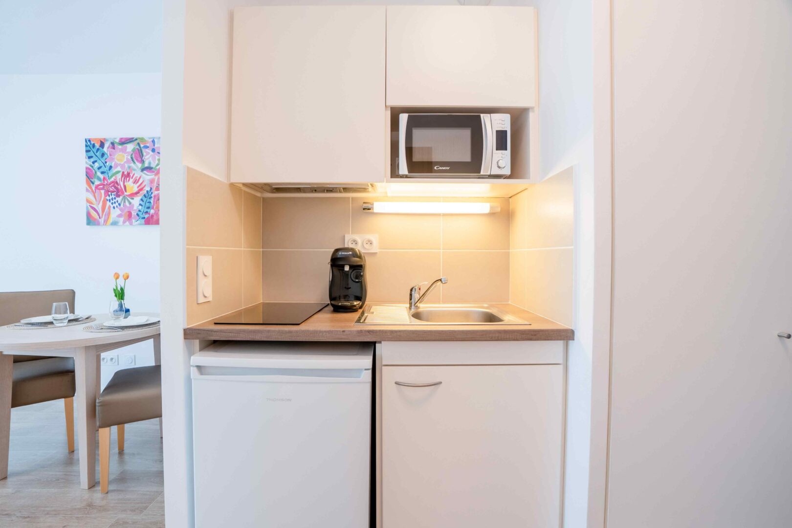 Cuisine équipée (vaisselle, bouilloire, réfrigérateur, plaques de cuisson, micro-ondes, bouilloire)